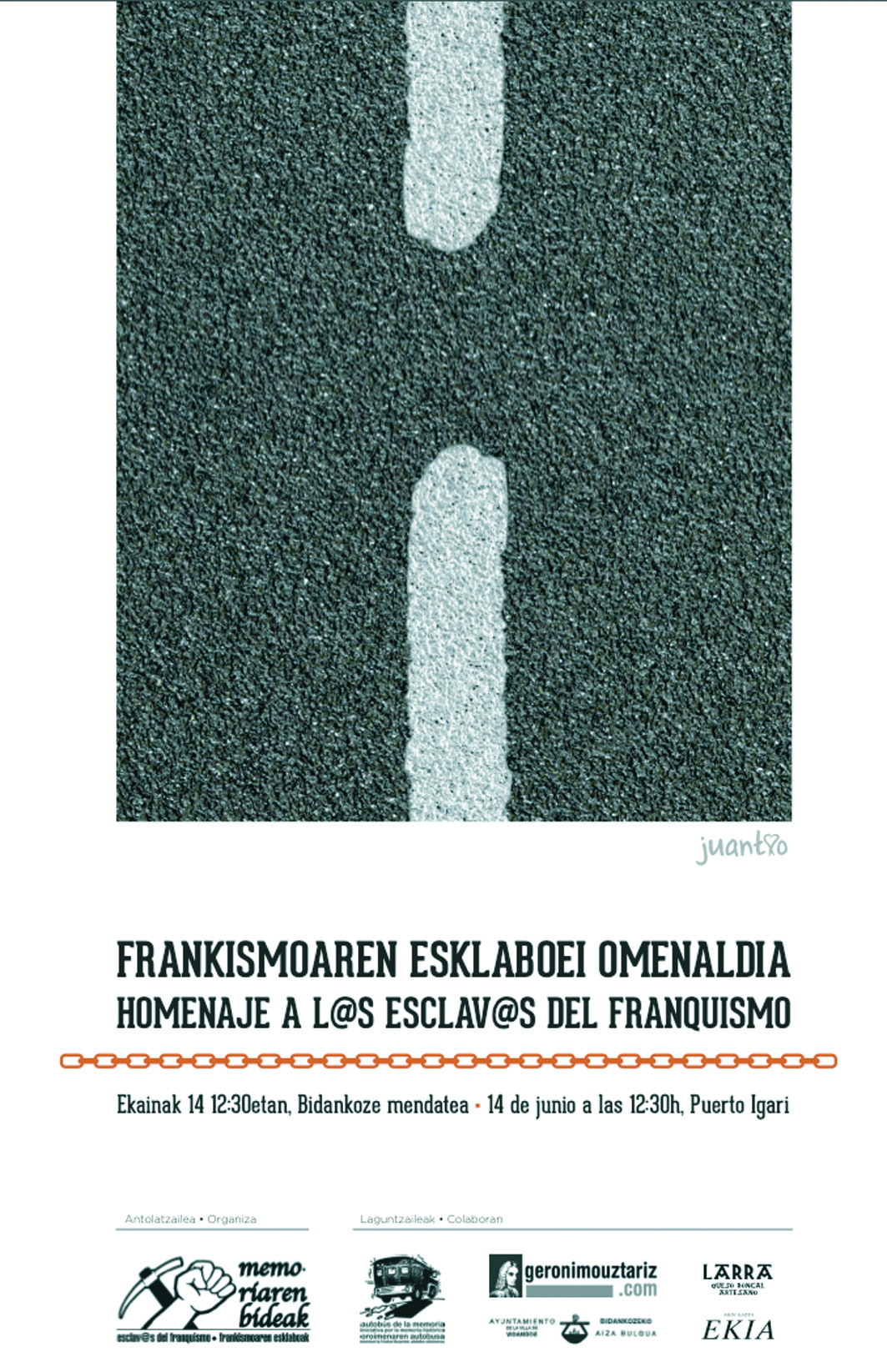 Con este homenaje se quiere reconocer a las esclavas y esclavos del franquismo, pero también se quiere denunciar la nueva forma de esclavización a la que las élites políticas y económicas están sometiendo a tod@s l@s trabajador@s del mundo mediante el recorte de derechos sociales y laborales. Por ello desde Memoriaren Bideak se anima a participar en la celebración de estos 10 años de lucha y reivindicación.