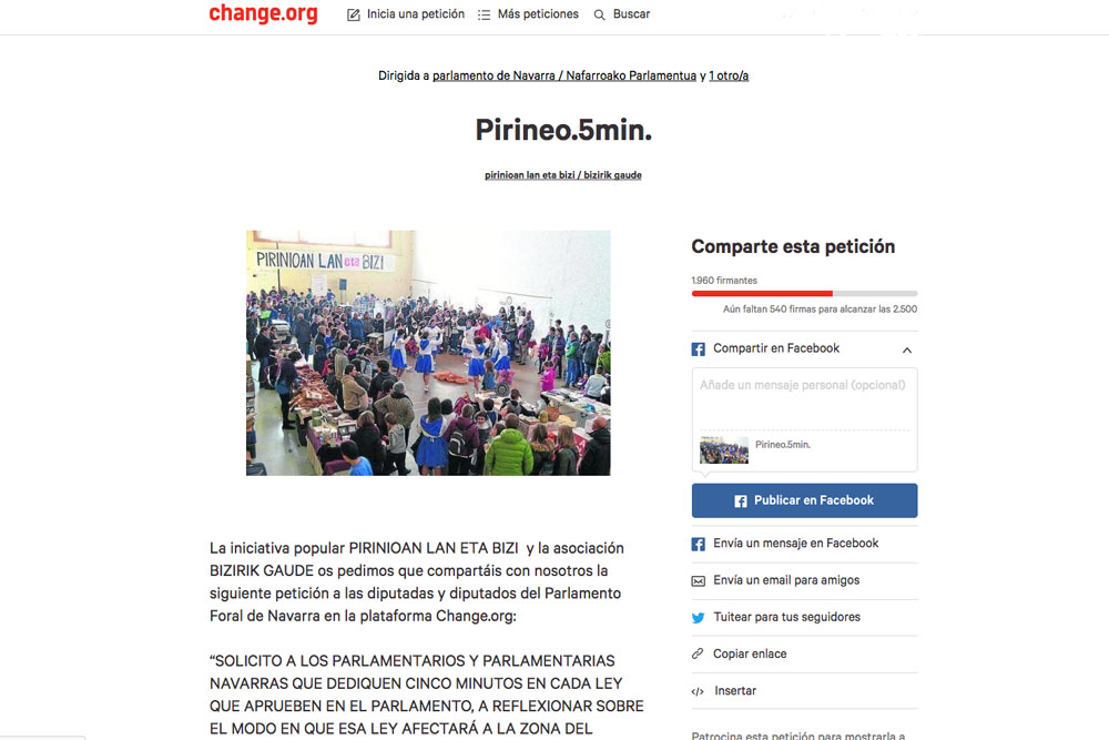 Las Asociaciones sin ánimo de lucro Pirineo Lan eta Bizi y Bizirik Gaude están llevando una recogida de firmas en la Plataforma Change.org en la que solicitan que la despoblación que sufre el Pirineo Oriental Navarro esté en la agenda del Parlamento de Navarra. Hasta el momento llevan recogidas cerca de 2000 firmas.