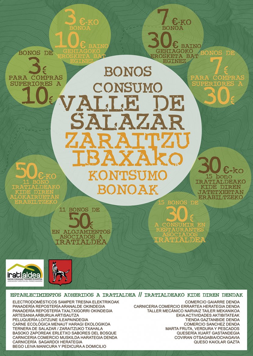 Con el objetivo de promover el consumo local la Junta del Valle de Salazar y la Asociación Turística Iratialdea han lanzado una campaña de sensibilización con la venta de bonos descuento. Está dirigida a personas empadronadas en el valle de Zaraitzu o que dispongan de una casa en él.
