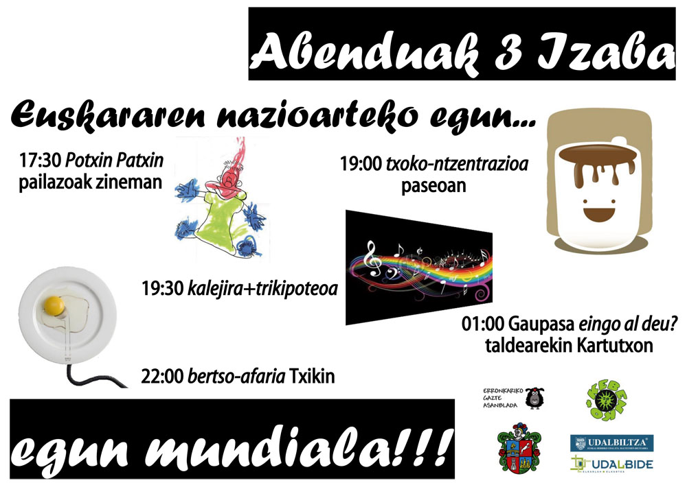 19:00: Choco-ncentración y kalejira en el paseo: concentración por el euskera con un delicioso chocolate caliente y lectura de un manifiesto por la lengua. A continuación, kalejira y triki-poteo con música.