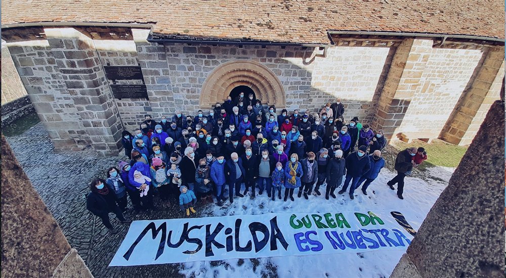 Un centenar de vecinas y vecinos de Otsagabia y Ezkaroze se reunieron el 19 de diciembre en Muskilda para reivindicar la propiedad de la ermita y sus campos, respondiendo a un llamamiento hecho por el Patronato de Muskilda. Una cadena humana alrededor de la ermita, una foto de grupo que será difundida a los medios de comunicación y a redes sociales y la lectura del comunicado han sido los actos simbólicos que han dado forma a la protesta.
