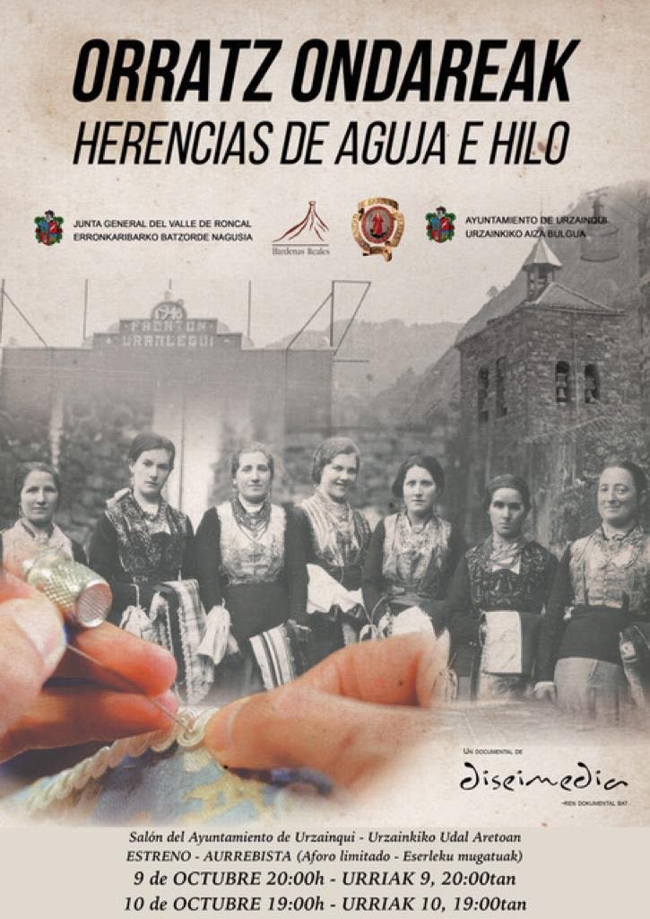 El 9 y 10 de octubre se estrena en Urzainki el documental "Orratz ondareak / Herencias de Aguja e Hilo". Tiene una duración de 31 minutos y ha sido promovido por el Ayuntamiento de Urzainki. Recoge la historia de la creación de 6 trajes tradicionales roncaleses y las vivencias de las personas que han participado en esos talleres, y que son un fiel reflejo de la vida de la localidad en los últimos cincuenta años.