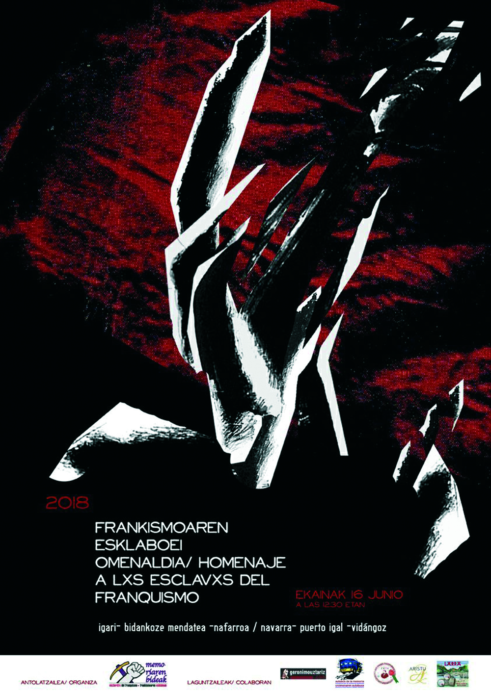 El día 16 de junio tendrá lugar el homenaje a l@s esclav@s del franquismo en el alto de Igal-Vidángoz. El homenaje de este año tiene un lema, “Esclavos del Franquismo, esclavas del patriarcado”, ya que ademas de denunciar el uso del trabajo forzado en el franquismo, se quiere hacer una denuncia de una de las formas de esclavitud mas extendidas hoy en día, la trata de mujeres. Por eso, además de prisioneros y familiares, contaremos con la presencia de una activista contra esa trata, con Amaia Kowach, que ha estudiado las redes de solidaridad de mujeres con los presos de San Cristobal. Habrá también canciones del grupo Las Tipex y bertsolaris.