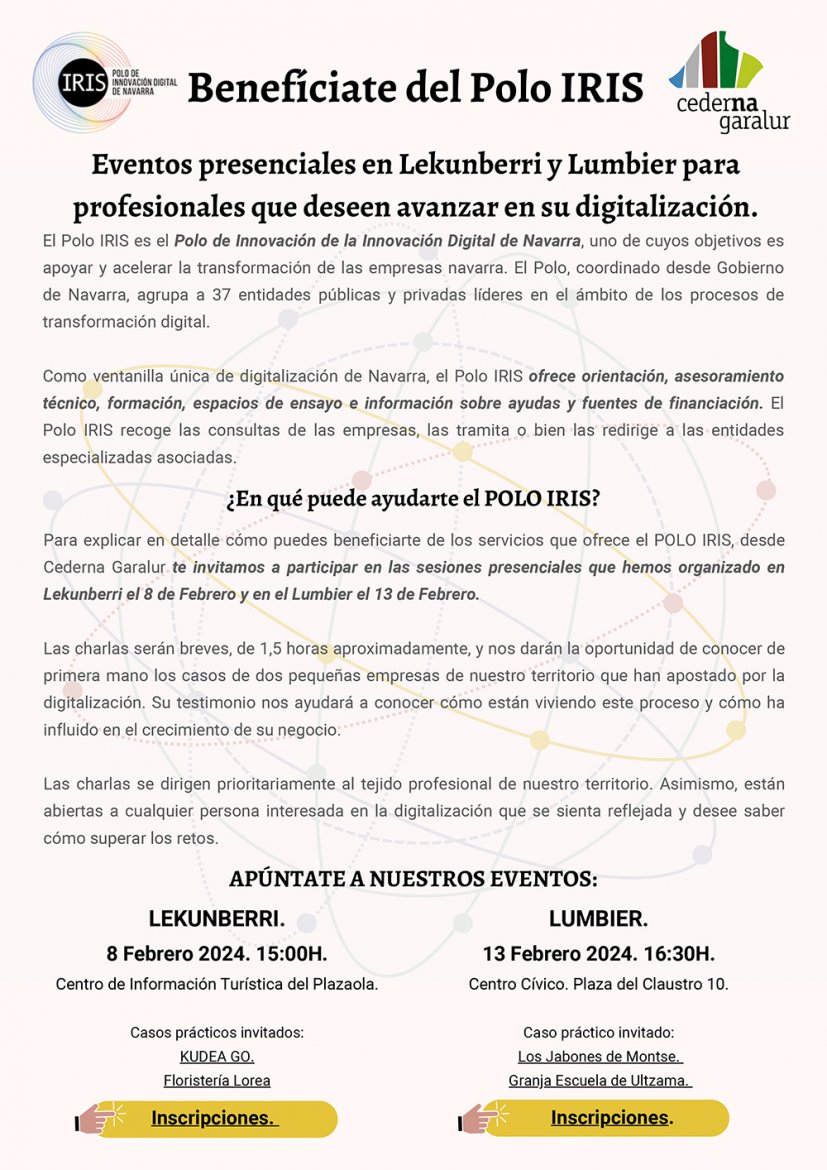 Con el fin de explicar en detalle sus servicios, el Polo IRIS en colaboración con la Asociación Cederna Garalur, ha organizado dos sesiones de presentación. La primera sesión será en Lekunberri el 8 de Febrero en el Plazaola a las 15:00h, y la segunda se celebrará en Lumbier el día 13 de Febrero en el Centro Cívico a las 16:30h.